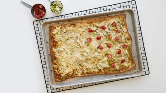 Make this delicious summer pesto flatbread with fresh toppings, which is made easy with refrigerated pizza dough.