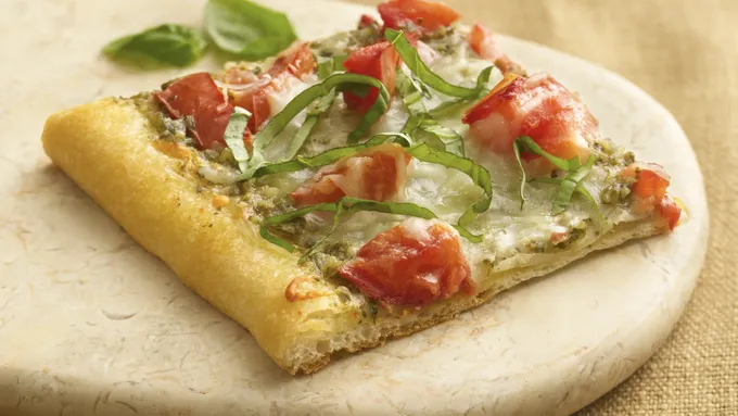 Presto! This pepped-up pizza gets refreshing flavors from pesto, chicken, tomatoes and cheese. Get a jump start on your Chicken Pesto Pizza with the help of Pillsbury™ Thin Crust Pizza Crust. This pesto pizza can be ready to serve in 15 minutes, making it a perfect meal for busy weeknights. It also doubles as an impressive appetizer for any occasion. Chicken Pesto Pizza is one tasty homemade dish.