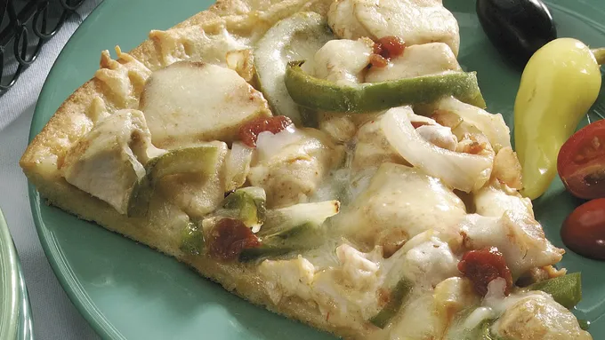 This flavorful pizza is topped with chicken and colorful garden veggies.