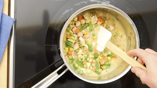 Step2In 3-quart saucepan, mix soup, chicken and frozen vegetables. Heat to boiling over medium-high heat; boil 1 minute, stirring occasionally. Spoon into baking dish.
