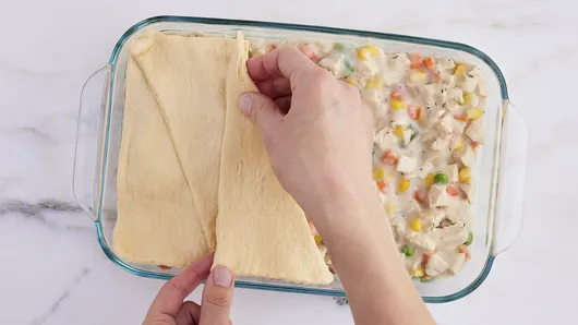 Unroll crescent dough; separate into triangles. Place on top of hot chicken mixture, overlapping slightly, to look like braided appearance.