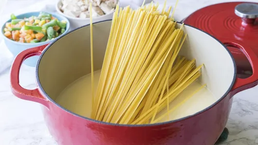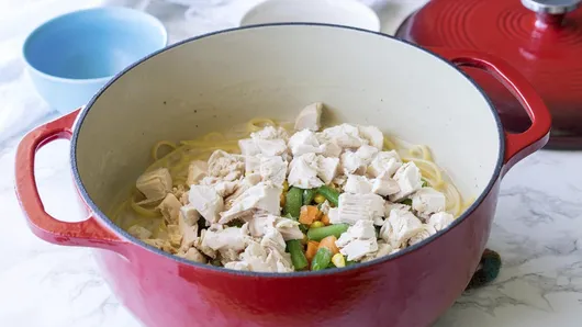 In this easy one-pot meal, the flavors of a classic chicken pot pie are turned into a tasty twist on fettuccine.