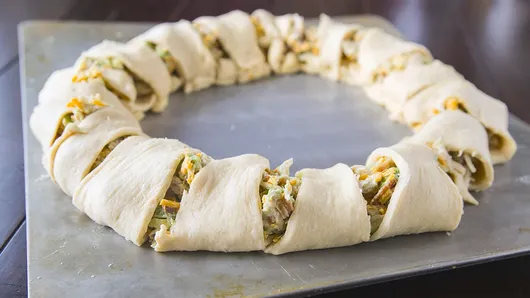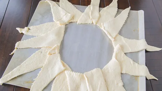 Step2Separate dough from 2 cans (8 oz each) Pillsbury™ refrigerated crescent dinner rolls into 16 triangles. On ungreased cookie sheet, arrange 8 triangles in ring with short sides in center. Arrange remaining 8 triangles in gaps to form a complete circle with at least a 2-inch area of dough to place filling on.