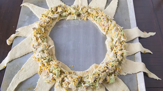 Step3In large bowl, stir together 2 cups shredded cooked chicken, 5 slices crumbled, crisply cooked bacon, 1 cup shredded Cheddar cheese, 1 pitted, peeled and diced avocado and 2 tablespoons mayonnaise. Spread chicken mixture evenly around dough ring.