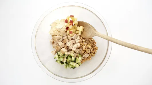 Step1In medium bowl, combine chicken, apple, cucumber and cashews; mix well. Add 2 tablespoons mayonnaise, onion powder, salt and pepper; mix well.