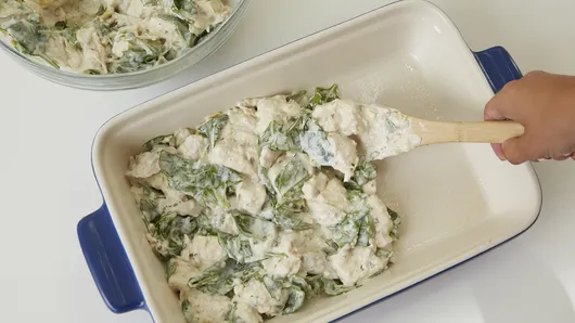 Step3Separate dough into 8 biscuits; cut each into sixths. Gently stir cut biscuits into cream cheese mixture; stir in chicken, spinach and artichoke hearts. Spoon into baking dish.