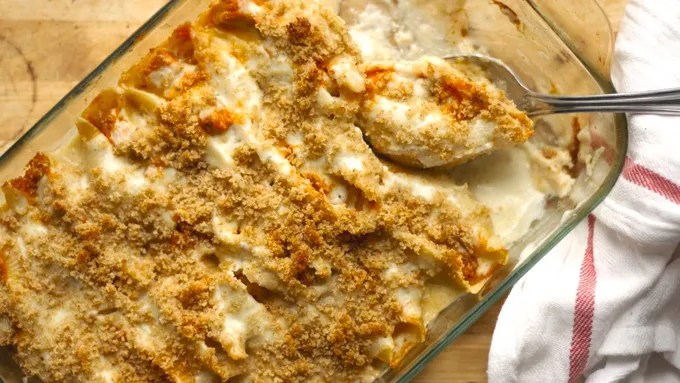 Step3Pour pasta sauce into baking dish; spread to evenly coat bottom of dish. Place filled shells over sauce, filled sides up. Drizzle Alfredo sauce over shells. Sprinkle with Parmesan cheese. Cover tightly with foil.
