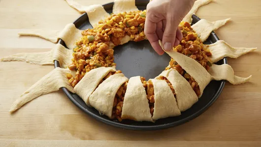 Step4Spoon chicken filling onto widest part of dough. Pull end points of triangles over filling and tuck under dough to form ring. (Filling will be visible.)
