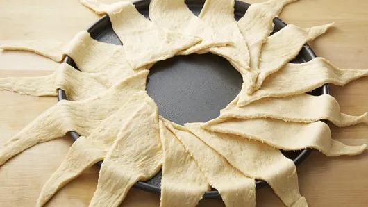 Step3Unroll both cans of dough; separate into 16 triangles. Arrange triangles on sprayed cookie sheet with short sides of triangles toward center, overlapping into wreath shape and leaving 5-inch round opening in center. Lightly press short sides of dough to flatten slightly.