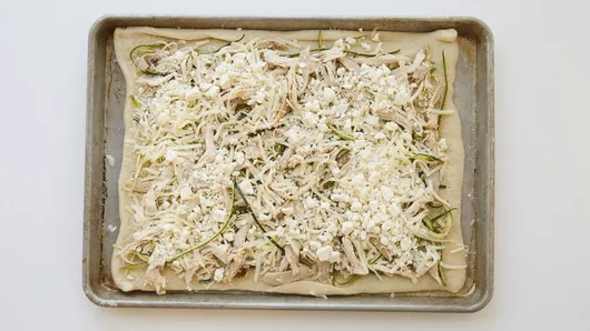Step2Meanwhile, in small bowl, toss zucchini with remaining 1 tablespoon olive oil and the black pepper. Top partially baked crust with chicken, zucchini and cheeses. Bake 10 to 12 minutes longer or until cheese is melted and crust is deep golden brown.