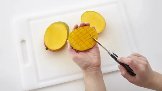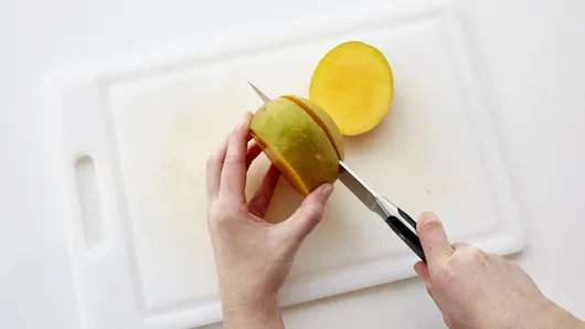Step3To remove mango pieces, push skin inside-out so cut mango pieces fan out, and cut pieces from skin. Cut two remaining narrow sides from pit by cutting around pit. Peel and cut mango pieces. Repeat for remaining mango.
