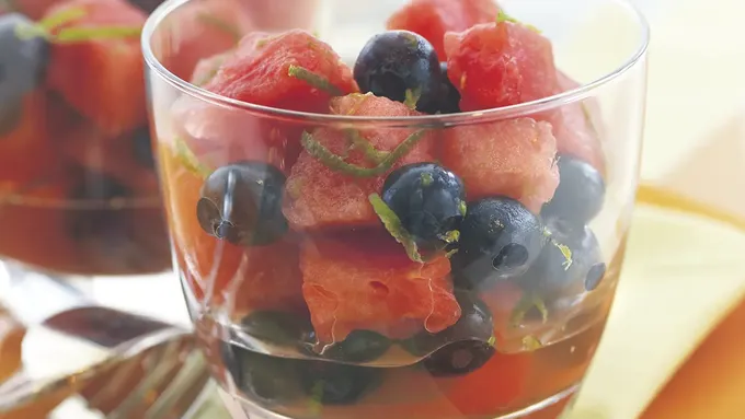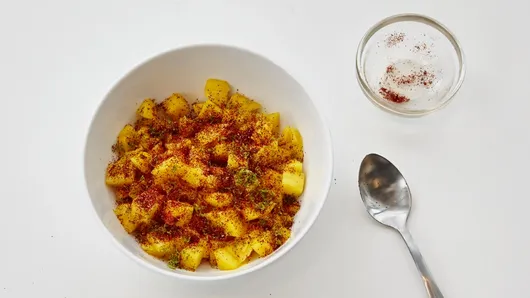 Fresh mangoes are infused with lime and ancho chile powder for a simple and refreshing twist on fruit salad. It’s sweet, savory and tangy for an addictive snack or side dish.