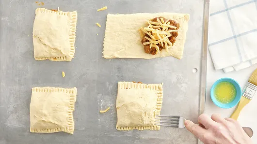 Step2Top short side of each rectangle half with 1/4 cup chili. Sprinkle with 2 tablespoons cheese. Fold dough over filling; press edges with fork to seal. Brush with melted butter.