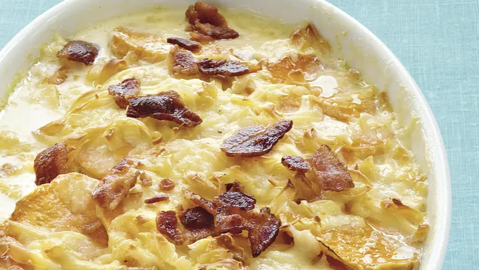Step2Heat oven to 350°F. Spray 2-quart oval gratin dish or 3-quart casserole with cooking spray. Arrange potato slices overlapping in gratin dish.