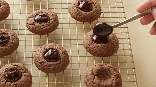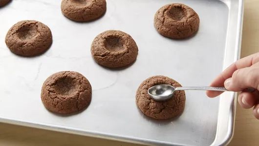 Step3Bake 10 to 13 minutes or until edges are set. Remove from oven. Using back of round metal measuring teaspoon, make 1-inch indentation in center of each cookie. Cool 1 minute on cookie sheets; remove to cooling rack. Cool completely, about 30 minutes.