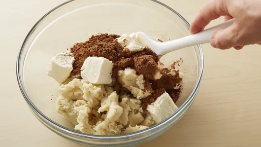 Step2In large bowl, crumble cookie dough; stir or knead in cocoa and cream cheese until well mixed. Shape tablespoonfuls dough into 24 (1 1/2-inch) balls. Place 1 inch apart on ungreased cookie sheet.