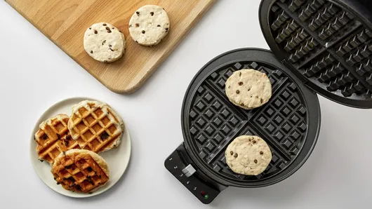 Step2Place 2 biscuits at a time on hot waffle maker. Close lid of waffle maker; bake 2 to 3 minutes or until light golden brown. Carefully remove waffles. Repeat with remaining biscuits, greasing waffle maker between each set. On cooling rack, cool waffles completely, about 15 minutes.