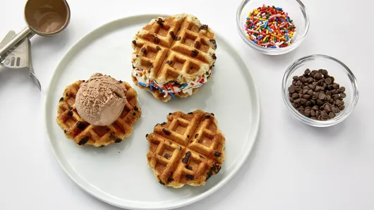 Step3To make sandwiches, with ice cream scoop, add about 1/4 cup ice cream to center of 1 waffle for bottom, and top with another waffle. Roll edges of ice cream in chocolate chips or sprinkles, if desired.
