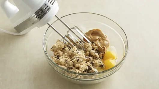 Step2In large bowl, break up cookie dough. Add milk, peanut butter and eggs. Beat with electric mixer on medium speed 1 to 2 minutes, scraping bowl as needed, until well blended.
