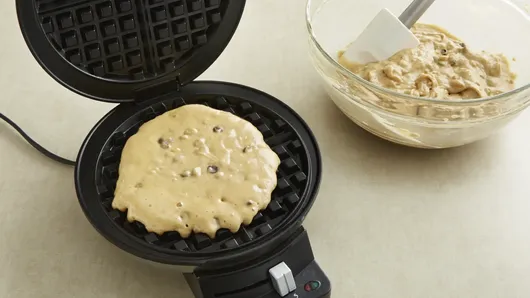 Step3To make waffles, pour 1/3 cup batter onto center of each waffle section. (Check manufacturer’s directions for recommended amount of batter.) Close lid of waffle maker. Bake about 3 minutes or until waffles are golden brown.