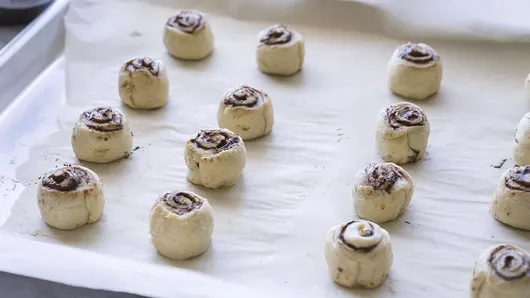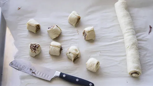 Step3Starting with opposite side of clean edge, roll up each rectangle; pinch clean edge to seal, forming a long roll. Cut each roll into 8 equal pieces.