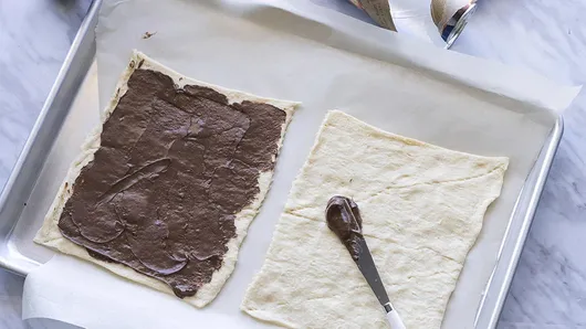Step2Unroll 1 can (8 oz) Pillsbury™ refrigerated crescent dinner rolls on work surface. Separate into 2 rectangles; pinch seams and perforations to seal. Spread 5 tablespoons hazelnut spread with cocoa evenly over both rectangles, leaving a clean edge on one side.
