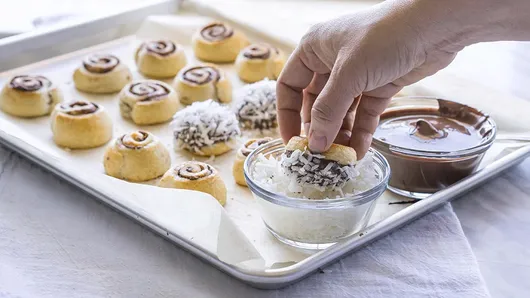 Step6Dip tops of each roll into melted candy, letting any excess drip off. Dip tops in 3/4 cup shredded sweetened coconut to cover; return to cookie sheet. Let stand until candy coating is set.