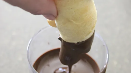 Step3Dip half of each crescent into chocolate. Let chocolate drip off before transferring to cooling rack to dry completely.