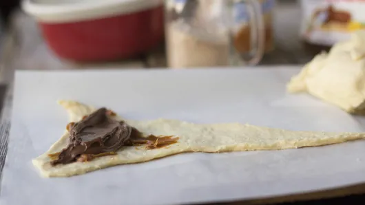 Step2Unroll dough; separate into 8 triangles. Flatten dough triangles slightly. Place 1 tablespoon hazelnut spread on shortest side (wide end) of each triangle; gently spread in straight line across wide end. Spoon 1 tablespoon dulce de leche over hazelnut spread on each triangle; spread gently.
