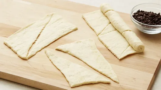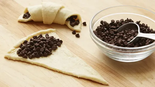 Step2Place tablespoon of chocolate chips on wide end of each triangle. Roll up, starting at shortest side of triangle, rolling to opposite point. Place on ungreased cookie sheet.