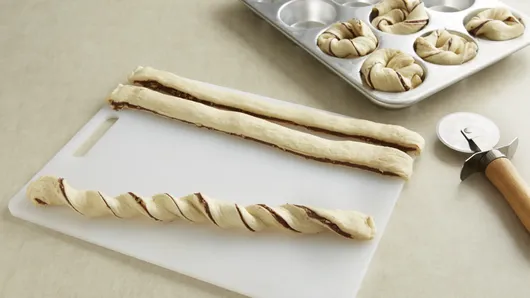 Step2Unroll remaining can of dough on work surface; firmly press perforations to seal. Press into 13x7-inch rectangle. Place over filling; press firmly and seal edges. Cut into 8 (13-inch) strips. Twist each strip 7 to 9 times; shape into tight coil. Place 1 coil in each muffin cup. (Muffin cups will be very full.)