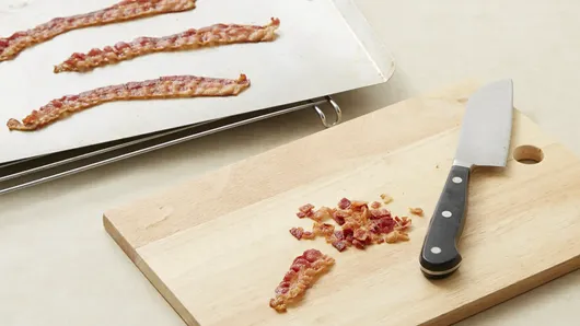 Step3Place bacon on cookie sheet. Bake 3 to 4 minutes or until crisp. Drain on paper towels. Cool 5 minutes; finely chop.