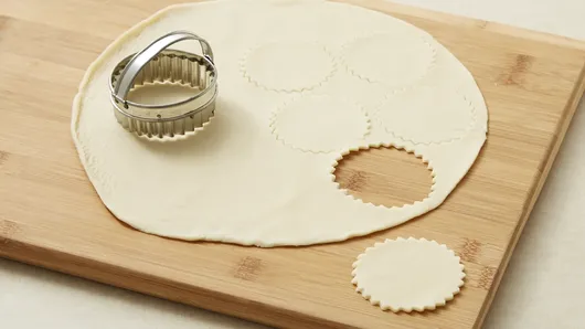 Step2Unroll pie crust on work surface. Using 2 1/2-inch fluted round cookie cutter, cut 12 rounds from pie crust. Press 1 round in bottom and 1/4 inch up side of each muffin cup. Prick bottom of each cup 3 times with fork. Bake 8 to 11 minutes or until golden brown. Remove cups from pan to cooling rack. Cool completely, about 10 minutes.