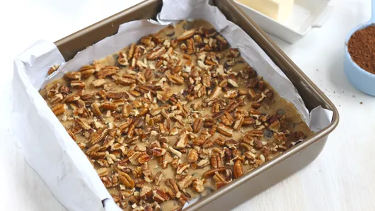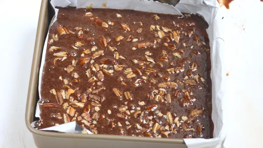 Step5Pour chocolate mixture over cooled crust. Sprinkle 1/2 cup chopped pecans over top.