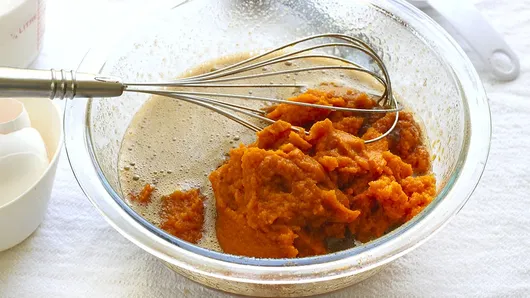 Step3In large bowl, beat brown sugar and the eggs until thoroughly blended. Gently fold in pumpkin pie spice and pumpkin. Stir in whipping cream.