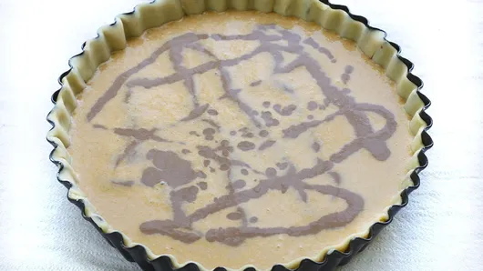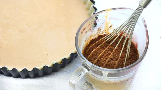 Step5With whisk, stir together reserved 1 cup pumpkin filling and baking cocoa until no lumps remain. Pour chocolate filling over pumpkin filling in pie plate. Slightly tap sides of plate so 2 fillings combine.