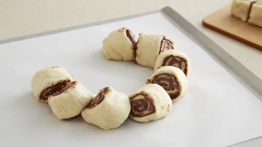 Step4With serrated knife, cut into 12 slices, wiping knife between cuts. Arrange slices on cookie sheet, seam side down, in a 7-inch diameter circle, leaning each slice against the previous one. Tuck last one under the first to complete the ring.