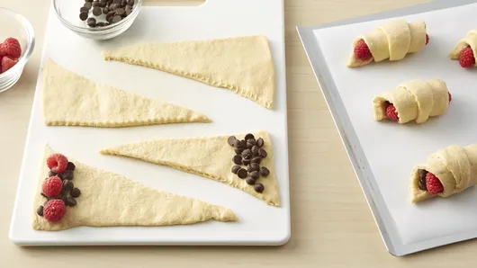Step3Place 1 tablespoon baking chips on shortest side of each triangle; top with 3 raspberries. Roll up at shortest side of triangle, rolling to opposite point. Place crescents, point side down, on cookie sheet.