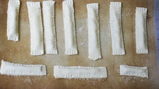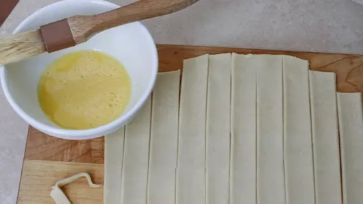 Step2On lightly floured work surface, unroll pie crust. Cut into 3/4-inch-wide strips; cut each in half crosswise. Trim ends to straighten. Brush each strip with beaten egg.