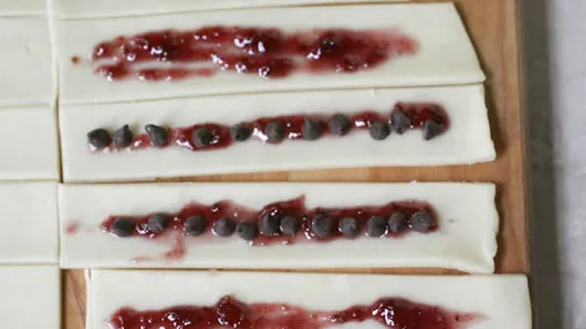 Step3On half of the strips, spoon about 1 teaspoon preserves in thin line lengthwise down center of each strip. Top preserves on each with row of miniature semisweet chocolate chips. Cover each topped strip with 1 remaining strip. Use fingers to press edges together. Press edges with fork to seal. Place on ungreased cookie sheet.