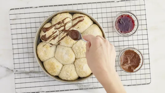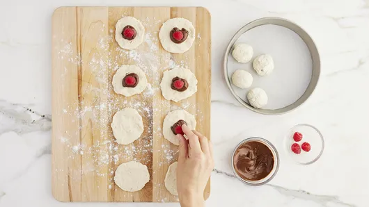 var configuration = {"title":"Chocolate Raspberry Stuffed Biscuits","introduction":"Add something sweet to family brunch with these chocolate raspberry biscuits. Pillsbury™ Grands!™ Buttermilk Biscuits dough is stuffed with chocolate hazelnut spread and fresh raspberries and baked for a dynamite dish. Top with additional chocolate hazelnut spread, raspberry jam, and additional raspberries for dessert or as an indulgent brunch treat. No matter what time of day you enjoy them, these Chocolate Raspberry Stuffed Biscuits are always a favorite. Enjoy!","servingSize":"2 Stuffed Biscuits","image":{"small":{"media":"(min-width: 0px)","src":"https://mojo.generalmills.com/api/public/content/CqvBKOLUqEqCNhxge2F2Mg_webp_base.webp?v=8f0a1ec0\u0026t=e724eca7b3c24a8aaa6e089ed9e611fd"},"medium":{"media":"(min-width: 500px)","src":"https://mojo.generalmills.com/api/public/content/CqvBKOLUqEqCNhxge2F2Mg_webp_base.webp?v=8f0a1ec0\u0026t=191ddcab8d1c415fa10fa00a14351227"},"large":{"media":"(min-width: 767px)","src":"https://mojo.generalmills.com/api/public/content/CqvBKOLUqEqCNhxge2F2Mg_webp_base.webp?v=8f0a1ec0\u0026t=191ddcab8d1c415fa10fa00a14351227"},"alt":"Chocolate Raspberry Stuffed Biscuits"},"contributor":{"label":"By","name":"Pillsbury Kitchens","profileUrl":"/about-us","displayDate":{"label":"Updated","date":"May 20, 2021"}},"ingredientGroups":[{"ingredients":[{"quantity":"6","description":"biscuits from 1 bag (25 oz) frozen Pillsbury™ Grands!™ Buttermilk Biscuits (12 Count)","productLink":"/products/biscuits/grands-frozen-biscuits/buttermilk"},{"quantity":"1/2","description":"cup chocolate hazelnut spread"},{"quantity":"12","description":"fresh raspberries, plus additional for garnish, if desired"},{"quantity":"1","description":"tablespoon butter, melted"},{"quantity":"1","description":"tablespoon sugar"},{"quantity":"1","description":"tablespoon seedless raspberry jam, room temperature, stirred well"}]}],"steps":[{"description":"Heat oven to 350°F. Lightly spray 8-inch round cake pan with cooking spray, or line with cooking parchment paper."},{"description":"On microwavable plate, microwave 3 biscuits uncovered on Medium-Low (30%) 1 to 1 1/2 minutes or until thawed. Repeat for remaining 3 biscuits. (If necessary, pat tops of biscuits with paper towel to remove extra moisture.) With serrated knife, carefully cut each biscuit in half to make 12 biscuit rounds. On lightly floured surface, press each biscuit into 3-inch round.","stepShotImageUrl":"//mojo.generalmills.com/api/public/content/Mx603grsF0K--CCPQ3oY5A_webp_base.webp?v=594f8bd6\u0026t=51a43a57af4046789e5a7f20567b1195"},{"description":"In small microwavable bowl, reserve 2 tablespoons of the chocolate hazelnut spread for topping; set aside. Place 1 generous teaspoon chocolate hazelnut spread and 1 raspberry in center of each dough round. Wrap dough around filling, pressing edges to seal. Place seam side down in pan in single layer.","stepShotImageUrl":"//mojo.generalmills.com/api/public/content/PAFHoaY_JEmhoMdobw_bBQ_webp_base.webp?v=eca0144b\u0026t=51a43a57af4046789e5a7f20567b1195"},{"description":"Brush tops of biscuits with melted butter; sprinkle with sugar. Bake 25 to 30 minutes or until biscuits are baked through and light golden brown."},{"description":"Microwave reserved chocolate hazelnut spread uncovered on Medium (50%) 10 to 15 seconds or until thin enough to drizzle. Drizzle chocolate hazelnut spread and jam onto biscuits; top with additional raspberries. Cool 10 minutes before serving.","stepShotImageUrl":"//mojo.generalmills.com/api/public/content/A2-xyKsVnUqAKgMoUAsEzA_webp_base.webp?v=bb2b877a\u0026t=51a43a57af4046789e5a7f20567b1195"}],"tips":[{"title":"","description":"Frozen biscuits may be thawed on a plate at room temperature 30 to 45 minutes.","category":"Method Note","tipShots":[]},{"title":"","description":"Be sure to get a good seal on the stuffed biscuits to make sure the filling stays inside during baking.","category":"Techniques","tipShots":[]},{"title":"","description":"These delicious stuffed biscuits are great warm, or just as good completely cooled.","category":"Serving Suggestions/Menu","tipShots":[]},{"title":"","description":"Kitchen Tested - 4/2021.","category":"Kitchen Tested","tipShots":[]}],"kitchenTips":[{"title":"","description":"Frozen biscuits may be thawed on a plate at room temperature 30 to 45 minutes.","category":"Method Note","tipShots":[]},{"title":"","description":"Be sure to get a good seal on the stuffed biscuits to make sure the filling stays inside during baking.","category":"Techniques","tipShots":[]},{"title":"","description":"These delicious stuffed biscuits are great warm, or just as good completely cooled.","category":"Serving Suggestions/Menu","tipShots":[]}],"additionalContent":[],"faq":[],"tipCategories":[{"categoryName":"Kitchen Tested","heading":"More About This Recipe","cssClass":"recipePartStory","expandOnInit":false,"expandText":"More +","collapseText":"Less -","expandEventName":"","collapseEventName":"","image":"","tips":[{"title":"","description":"Kitchen Tested - 4/2021.","category":"Kitchen Tested","tipShots":[]}],"isExpandable":false},{"categoryName":"Method Note","heading":"","cssClass":"recipePartMethodNote","expandOnInit":false,"expandText":"More +","collapseText":"Less -","expandEventName":"","collapseEventName":"","image":"","tips":[{"title":"","description":"Frozen biscuits may be thawed on a plate at room temperature 30 to 45 minutes.","category":"Method Note","tipShots":[]}],"isExpandable":false}],"nutritionInfo":{"configuration":{"showAsTable":false,"noNutritionInformationAvailableMessage":"No nutrition information available for this recipe","poweredByText":"\u003cp\u003eNutrition information for this recipe is estimated using a leading nutrition calculation application, but is an estimate only. Actual nutrition values will vary based on the exact ingredients or brands you may use.\u003c/p\u003e\n\u003ca href=\u0022http://developer.edamam.com\u0022\u003e