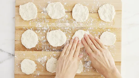On microwavable plate, microwave 3 biscuits uncovered on Medium-Low (30%) 1 to 1 1/2 minutes or until thawed. Repeat for remaining 3 biscuits. (If necessary, pat tops of biscuits with paper towel to remove extra moisture.) With serrated knife, carefully cut each biscuit in half to make 12 biscuit rounds. On lightly floured surface, press each biscuit into 3-inch round.