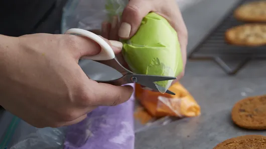 Step2Meanwhile, in medium microwavable bowl, microwave 1 cup of the white vanilla baking chips uncovered on High 45 seconds. Stir; if necessary, microwave in 15-second increments, stirring after each, until chips can be stirred smooth. Cool 5 minutes. Stir in frosting until well blended. Reserve 2 tablespoons of the frosting mixture to attach decorations. Use gel food colors to tint remaining frosting in desired colors. Spoon each color of frosting into resealable food-storage plastic bag. Cut 1/2 inch off one corner of bag, and pipe on bottom of 1 cookie. Press another cookie, flat side down, on frosting at an angle, cookies touching on one side and about 1 inch apart on the other, to look like open mouth.