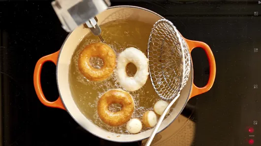 Step3Separate cans of dough into 24 biscuits. With 1-inch round cookie cutter, cut hole in center of each biscuit. Fry biscuits and holes in hot oil 1 to 1 1/2 minutes on each side or until golden brown. Drain on paper towel.