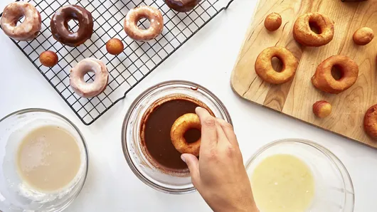 Step4Dip top of each doughnut into desired glaze. Serve warm.