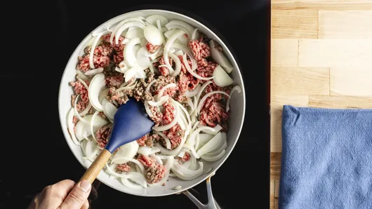 Preheat your oven to 425ºF and heat a large skillet over medium heat. Add your ground beef, onion, and seasoned salt, cooking until the beef is no longer pink, or about 8 minutes. Transfer the beef mixture to a plate and set it aside.
