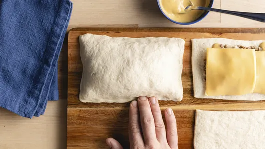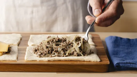 Spread an even layer of the beef mixture onto 4 of the dough rectangles. Drizzle the sauce over the beef, then top each with two slices of American cheese. Place the remaining dough rectangles on top of the filled ones, pressing the edges together to create a seal.
