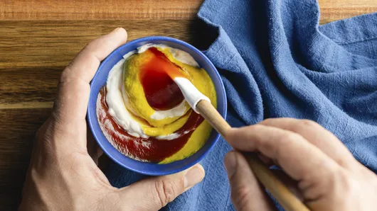 Unroll 2 Pillsbury pizza crusts onto a baking sheet. Cut each crust in half lengthwise and then crosswise to create 8 rectangles. In a small bowl, mix together mayonnaise, ketchup, and mustard until they’re all blended, and set this sauce aside.