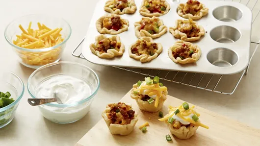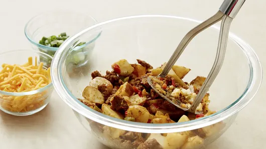Step3Meanwhile, in 10-inch skillet, cook sausage over medium-high heat, stirring frequently, until thoroughly cooked; drain. Add potatoes and cumin; cook and stir 1 minute. Remove from heat. With potato masher or fork, mash potatoes, leaving some small pieces. Add 1/2 cup of the cheese and 1/4 cup of the green onions to potato mixture; mix well. Spoon 1 tablespoon potato mixture into each cup.