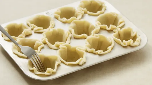 Step2Meanwhile, unroll pie crusts on work surface. Using 3-inch round cutter, cut 9 rounds from each pie crust. Gather scraps and reroll; cut 6 additional rounds. Press 1 round in bottom and up side of each of 24 ungreased mini muffin cups (edges of dough will be higher than side of cup); prick bottoms with fork. Bake 6 minutes.